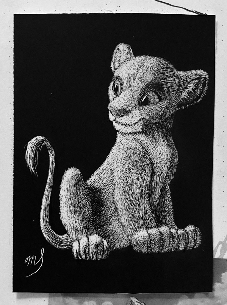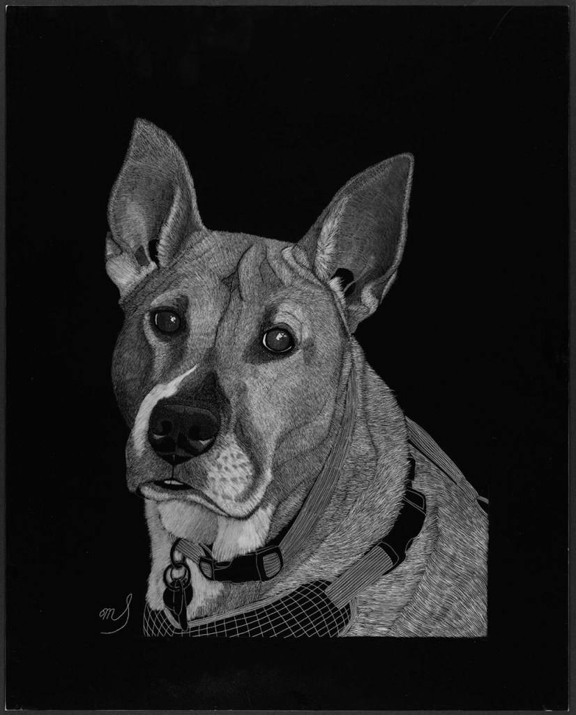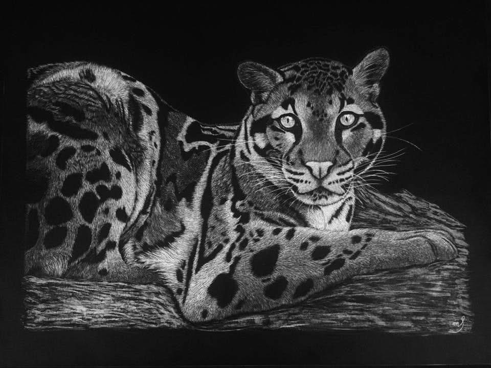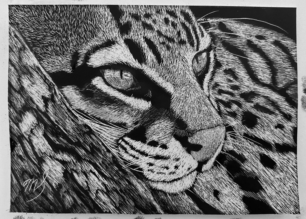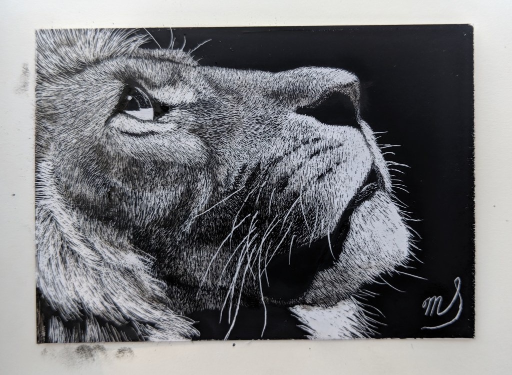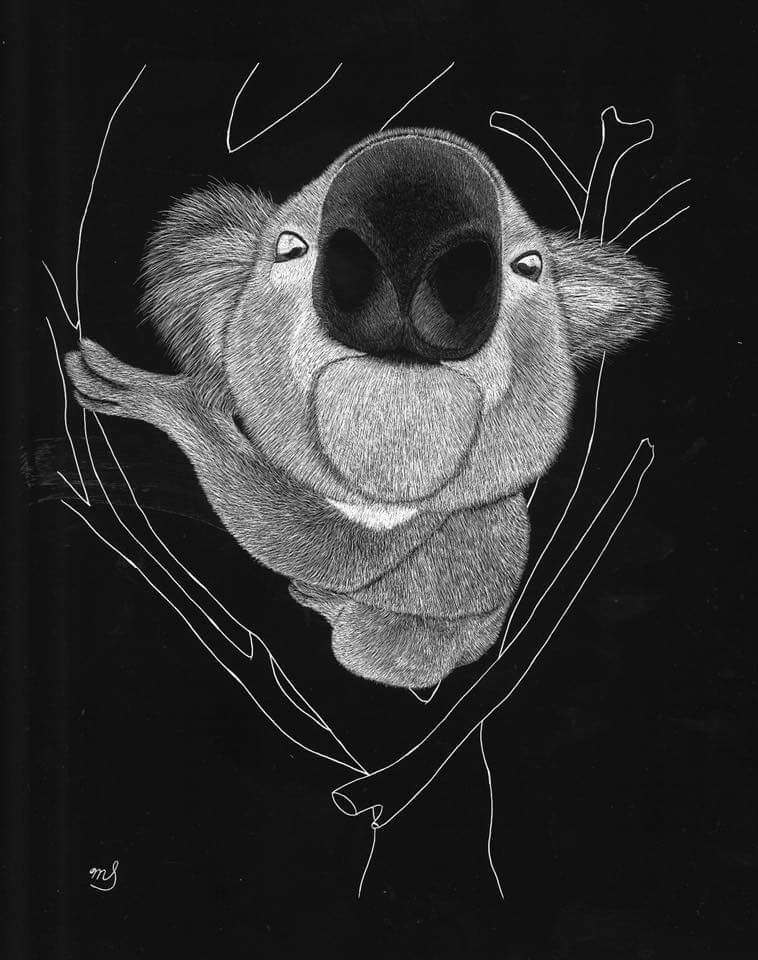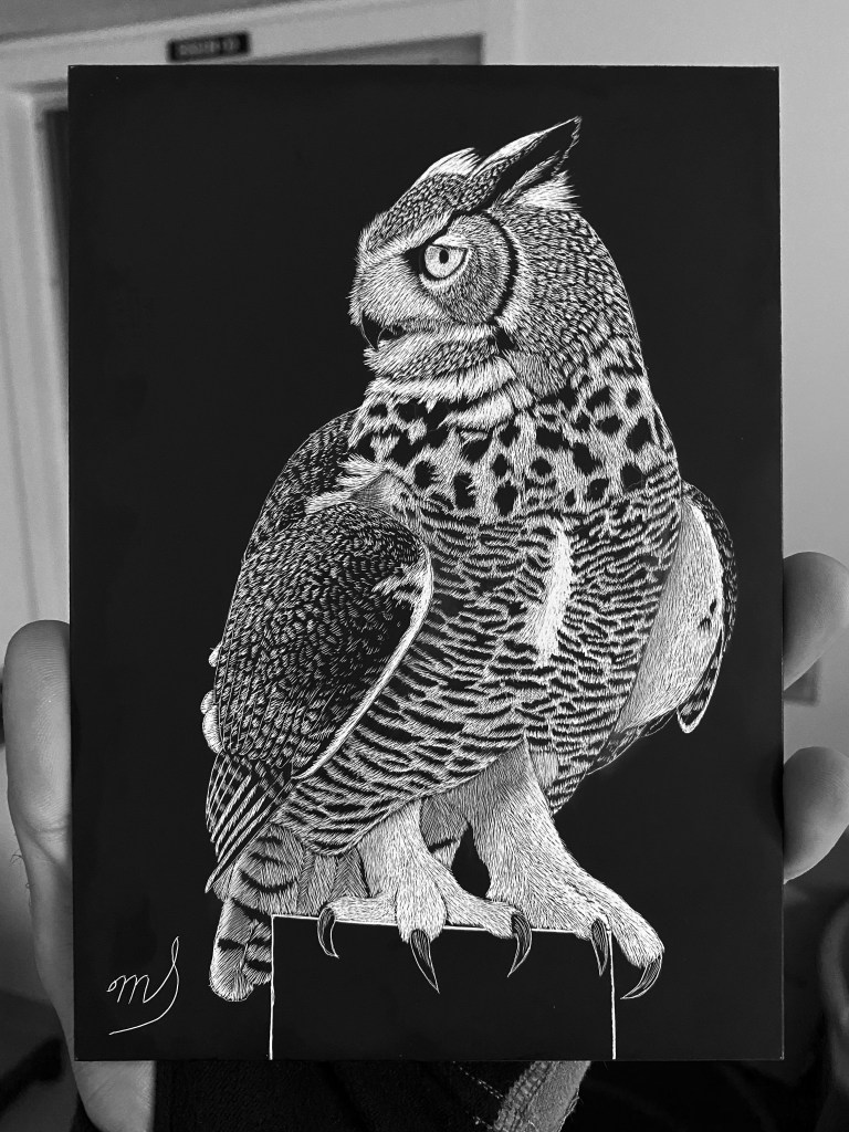 Scratch Art consists of two types. A scratchboard is a piece of particle board covered with a layer of white clay that is then covered with a layer of black India ink. Scratchpaper is a white piece of paper with a thin layer of plastic that is then covered with a layer of black India ink. Regardless of the type, the black ink is scratched off using primarily an Xacto knife and various other sharp tools. Basically drawing in the negative where the whole point is adding layers of highlights.
