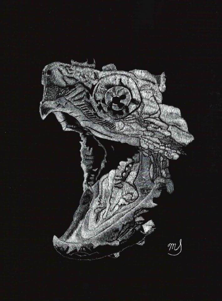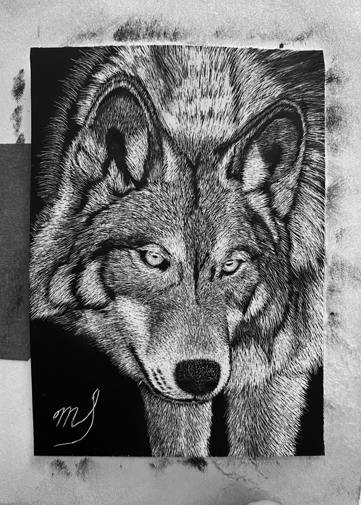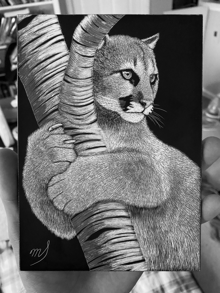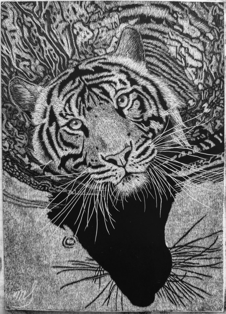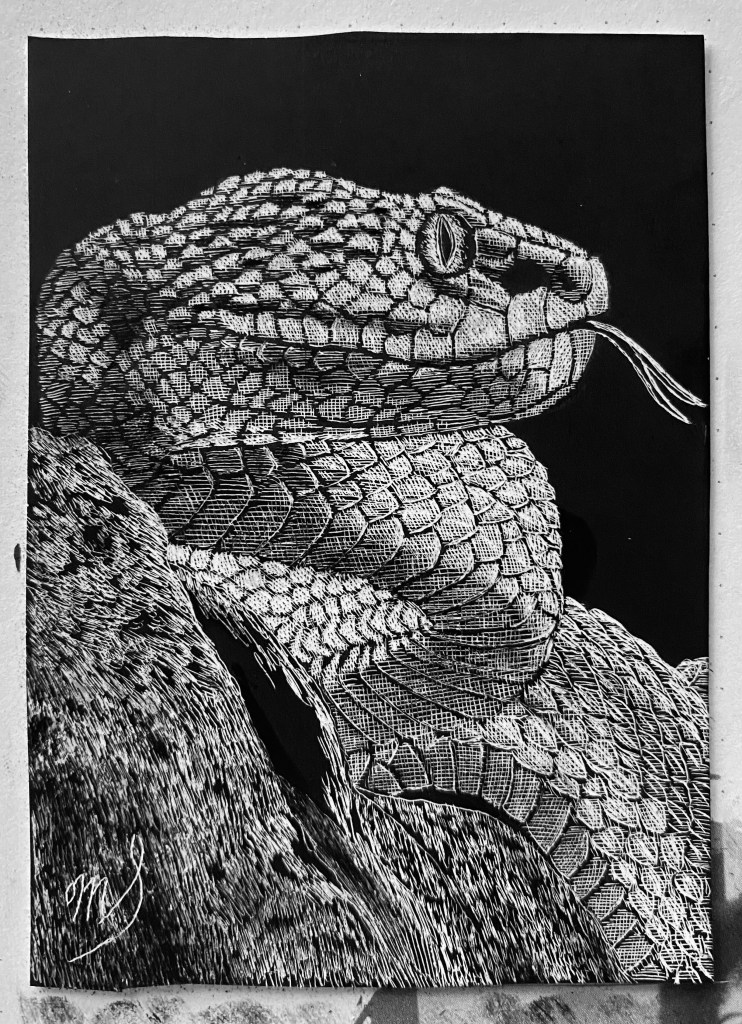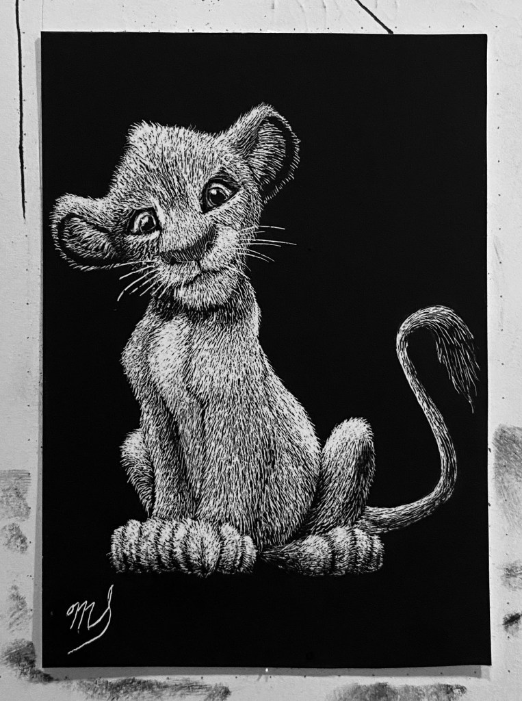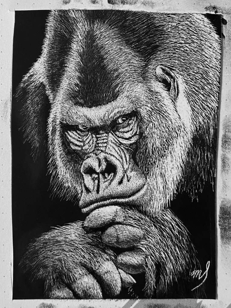 Scratch Art consists of two types. A scratchboard is a piece of particle board covered with a layer of white clay that is then covered with a layer of black India ink. Scratchpaper is a white piece of paper with a thin layer of plastic that is then covered with a layer of black India ink. Regardless of the type, the black ink is scratched off using primarily an Xacto knife and various other sharp tools. Basically drawing in the negative where the whole point is adding layers of highlights.