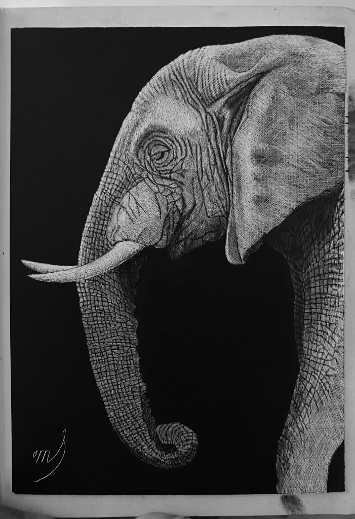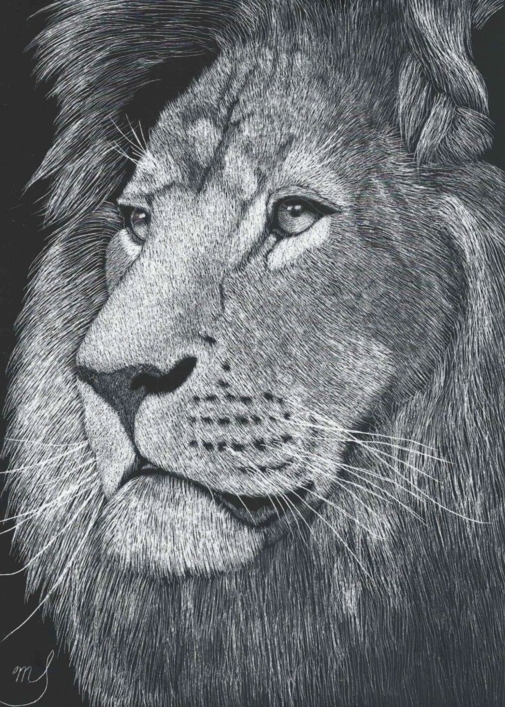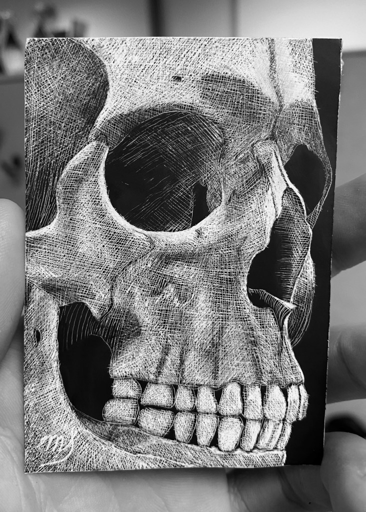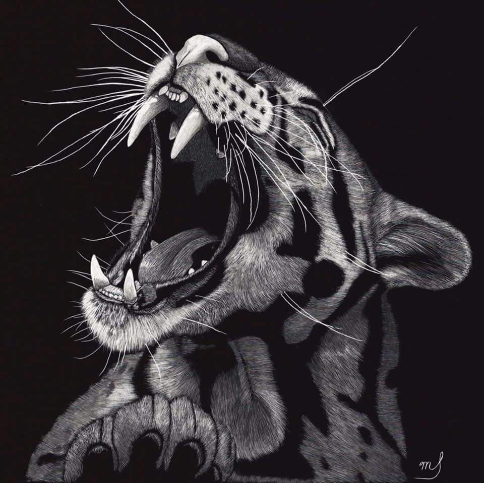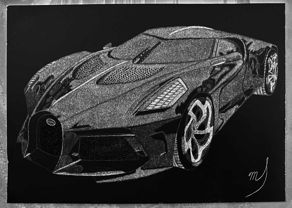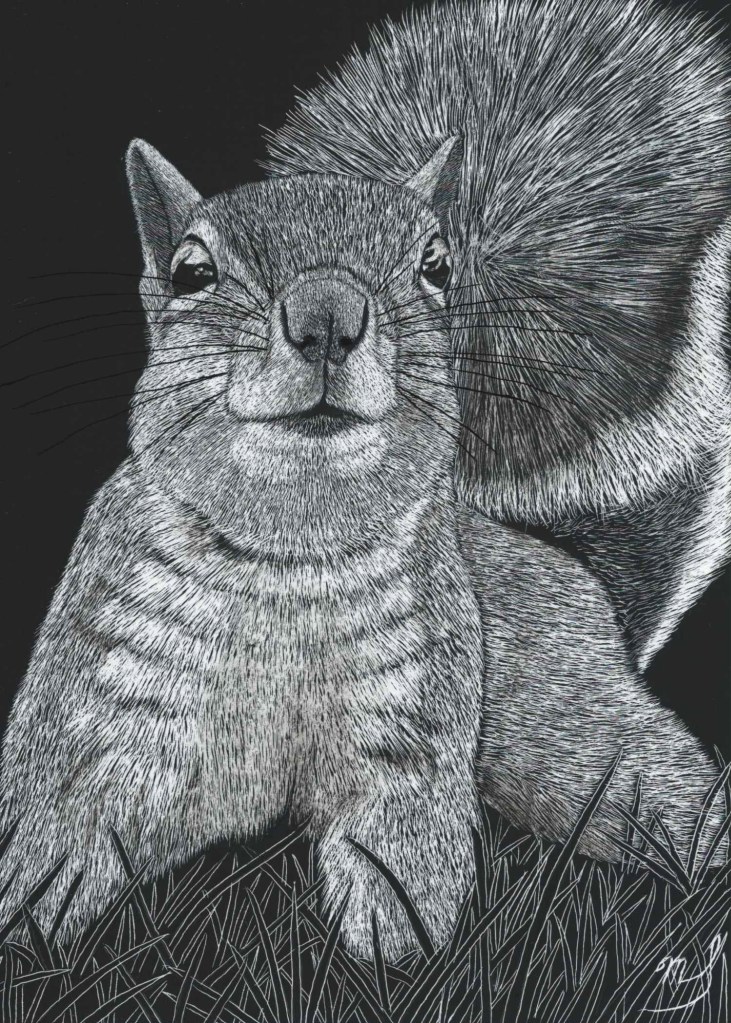 Scratch Art consists of two types. A scratchboard is a piece of particle board covered with a layer of white clay that is then covered with a layer of black India ink. Scratchpaper is a white piece of paper with a thin layer of plastic that is then covered with a layer of black India ink. Regardless of the type, the black ink is scratched off using primarily an Xacto knife and various other sharp tools. Basically drawing in the negative where the whole point is adding layers of highlights.