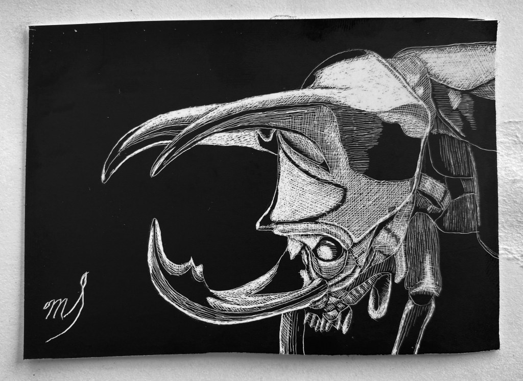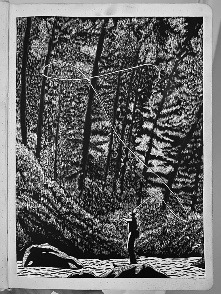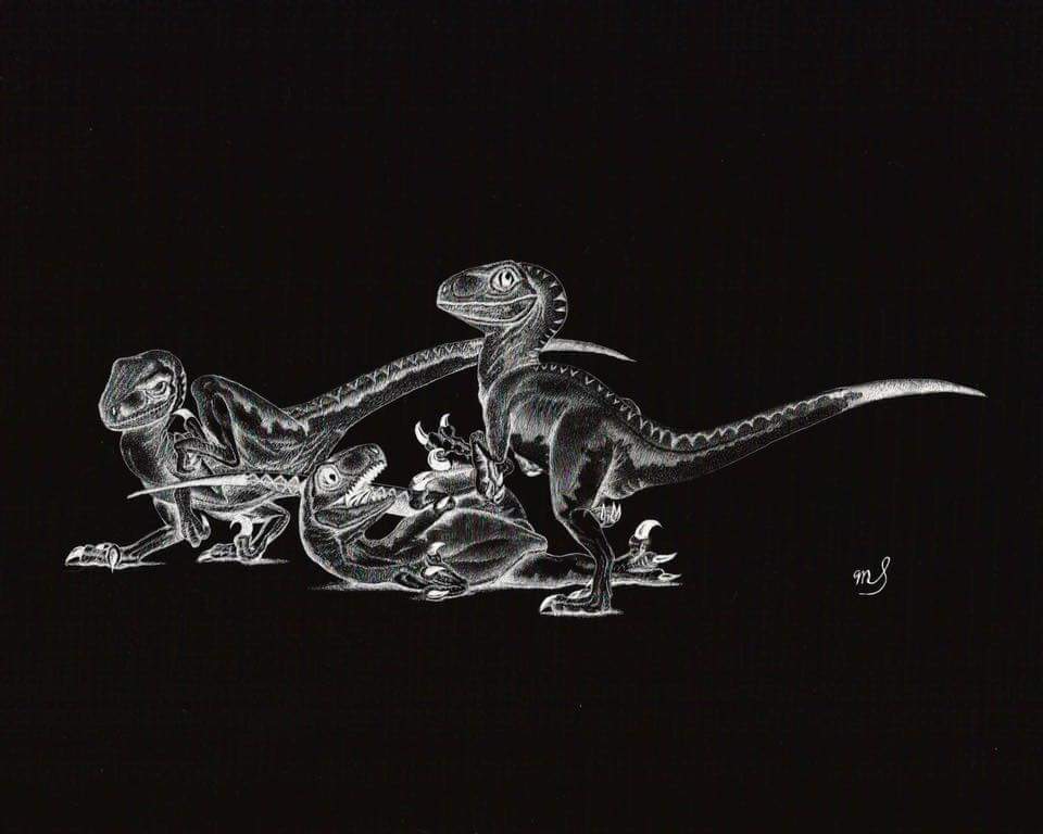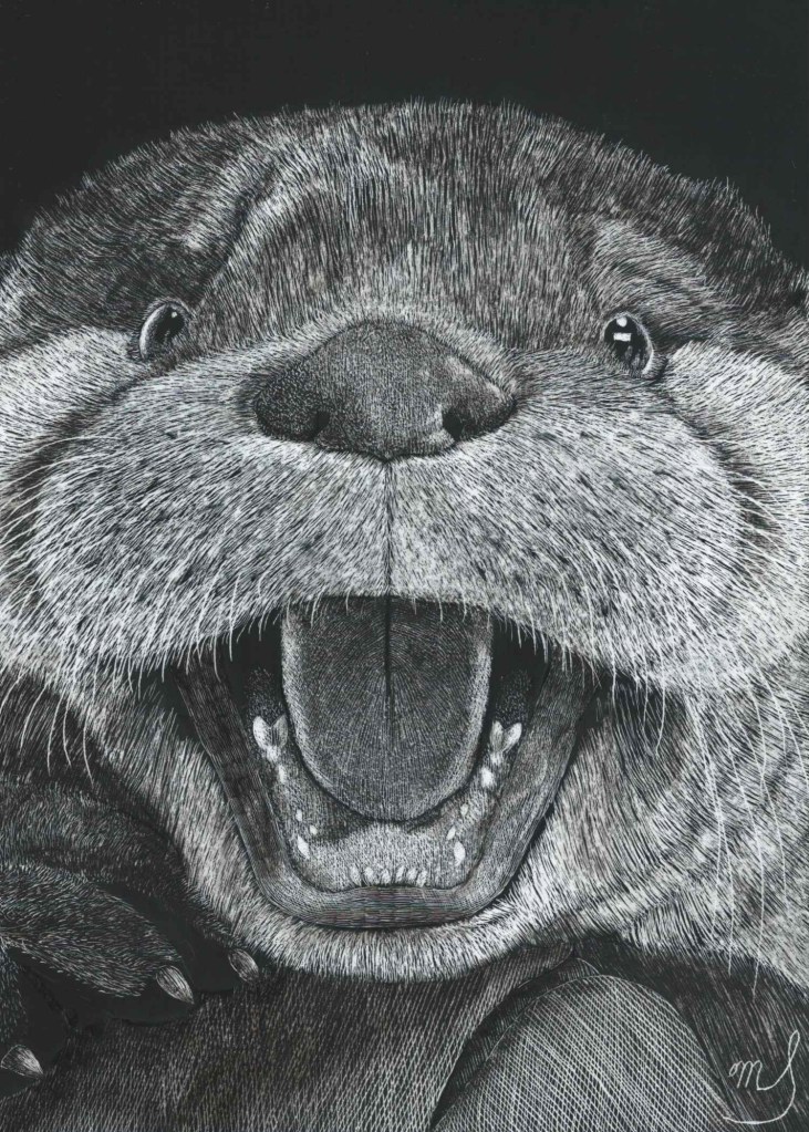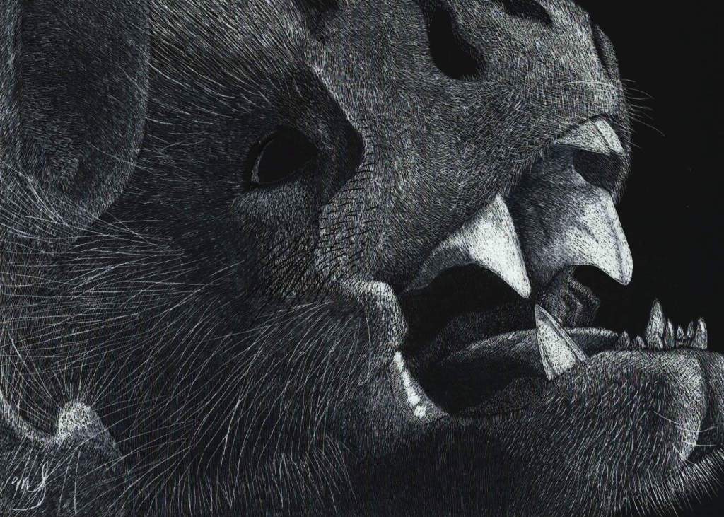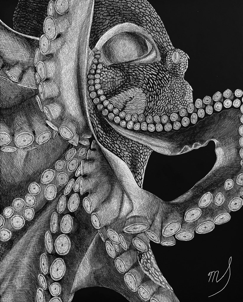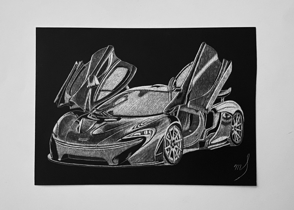 Scratch Art consists of two types. A scratchboard is a piece of particle board covered with a layer of white clay that is then covered with a layer of black India ink. Scratchpaper is a white piece of paper with a thin layer of plastic that is then covered with a layer of black India ink. Regardless of the type, the black ink is scratched off using primarily an Xacto knife and various other sharp tools. Basically drawing in the negative where the whole point is adding layers of highlights.